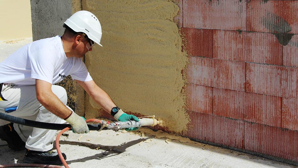 Dans le cadre d’un ravalement de façade on opte pour un enduit extérieur spécifique qui peut être appliqué par une machine à projection.